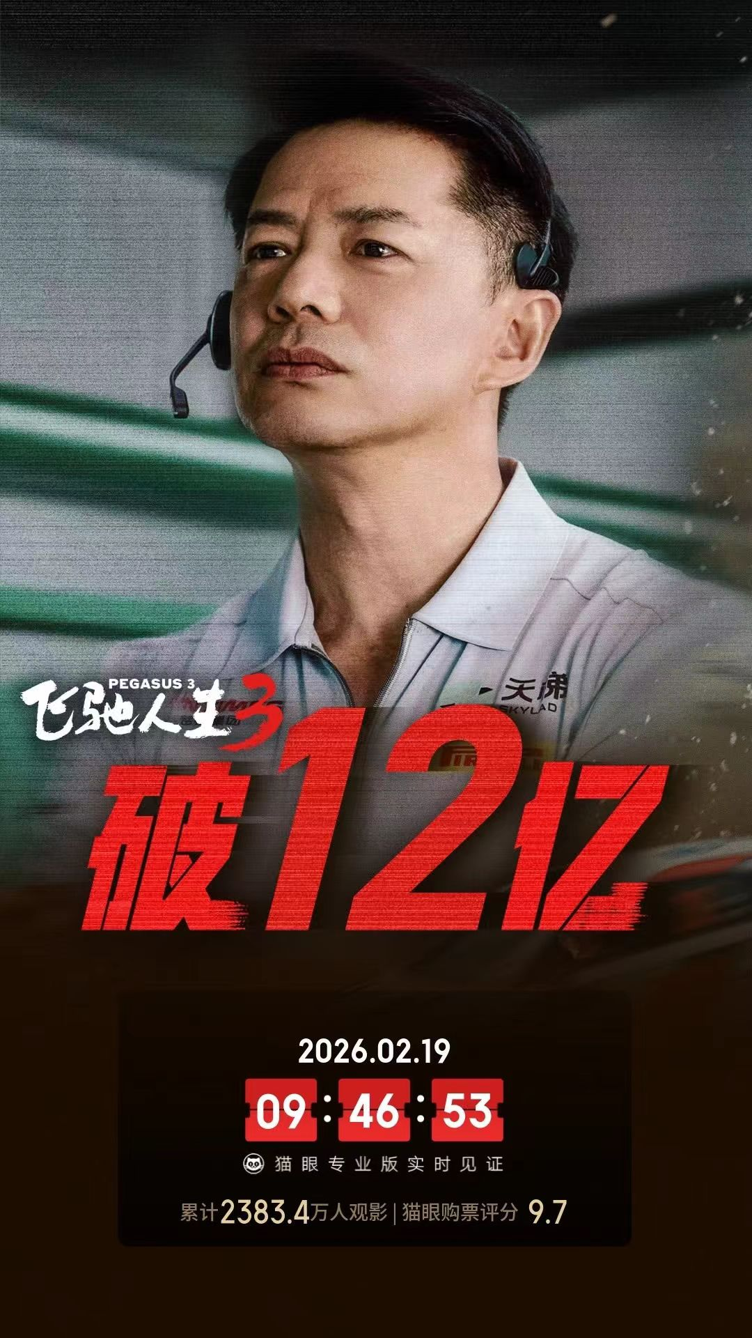 据猫眼专业版实时数据,截至2月19日9时46分,影片《飞驰人生3》实时票房突破12亿,稳居春节档电影首位。